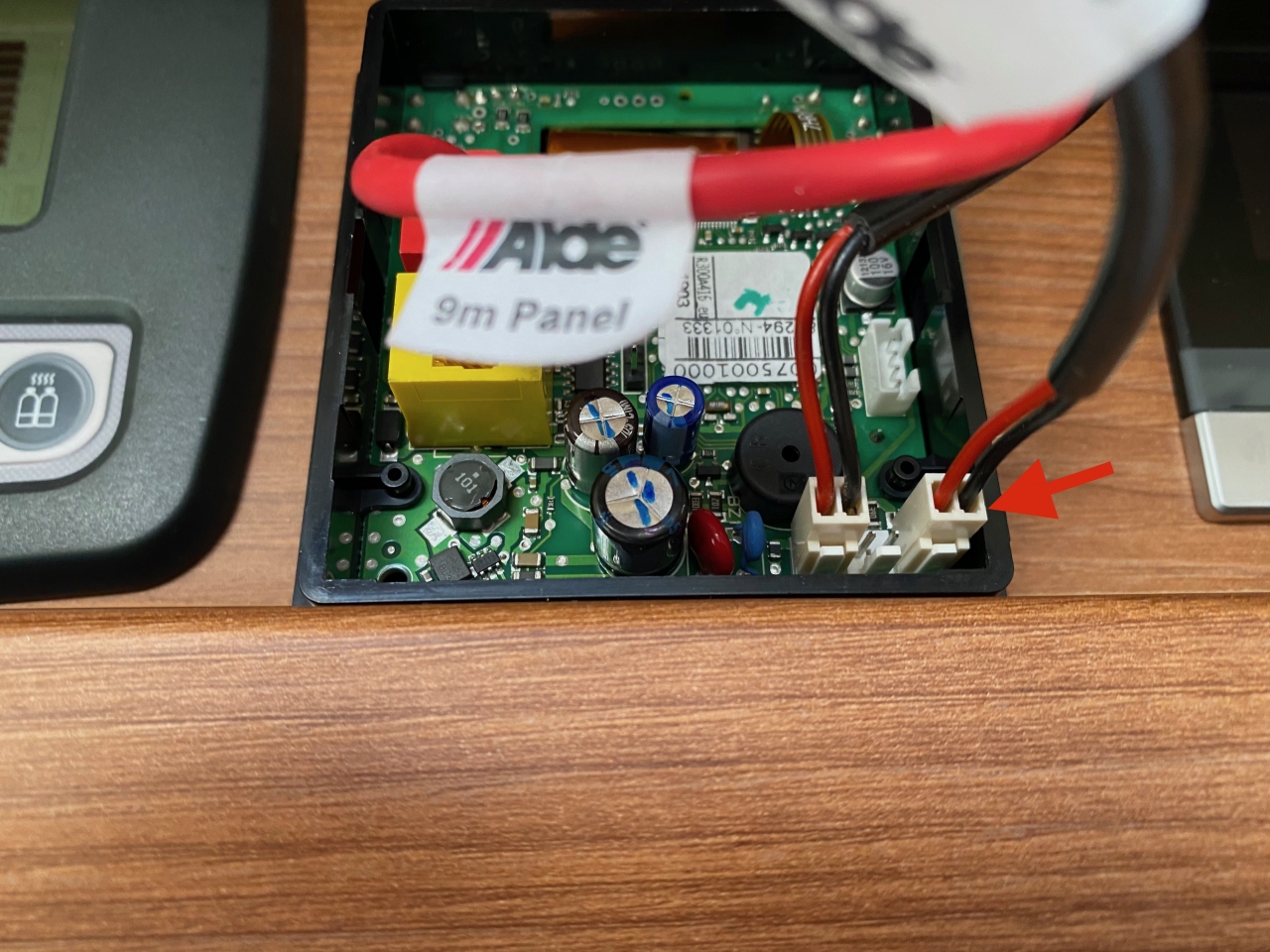 Steckplatz für den Kabelanschluss des Batterie-Backups (roter Pfeil)