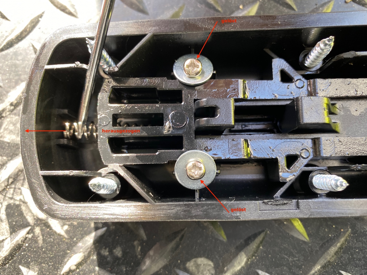 Lediglich die beiden Halteschrauben mit den großen Scheiben gelöst und die Feder dann mit einem kleinenSchraubenzieher herausgezogen.