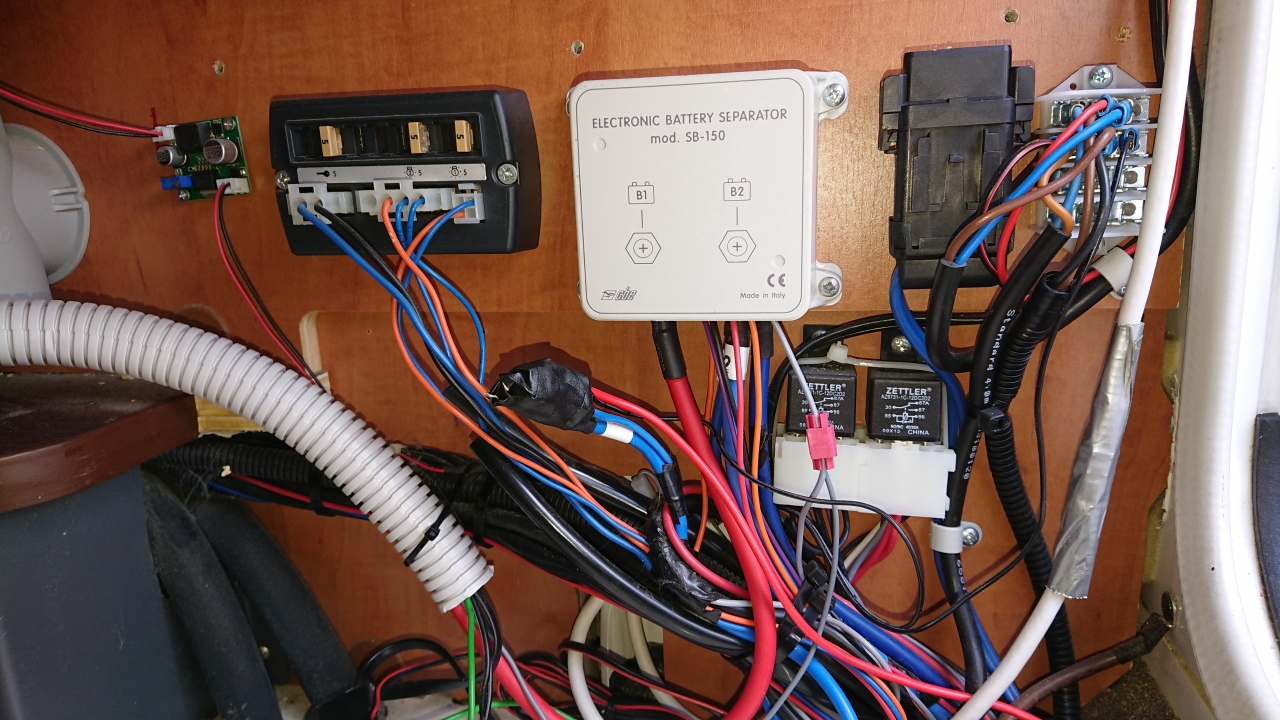 Von links: DC-DC-Wandler für Alarmanlage, Verteiler und Sicherungen für Positionsleuchten, Trenngerät, Sicherung für Kühlschrank, Stromverteiler für Fernseher und Trittstufe.