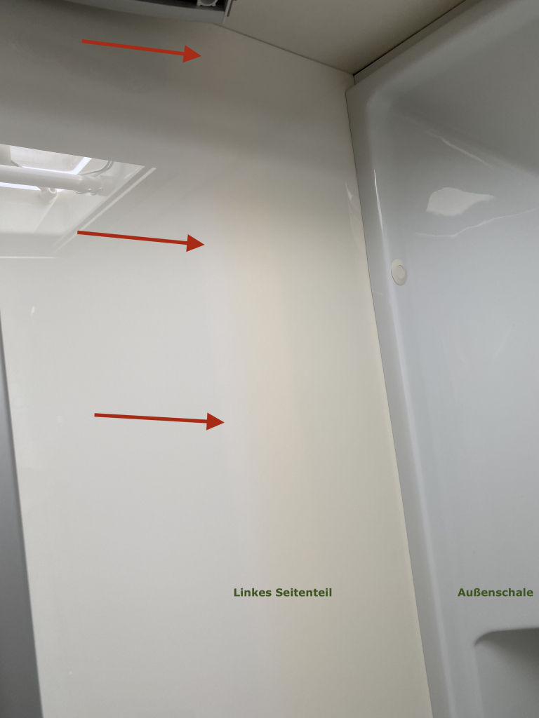 Linkes Seitenteil der Duschkabine mit Kennzeichnung der vergilbten Stellen