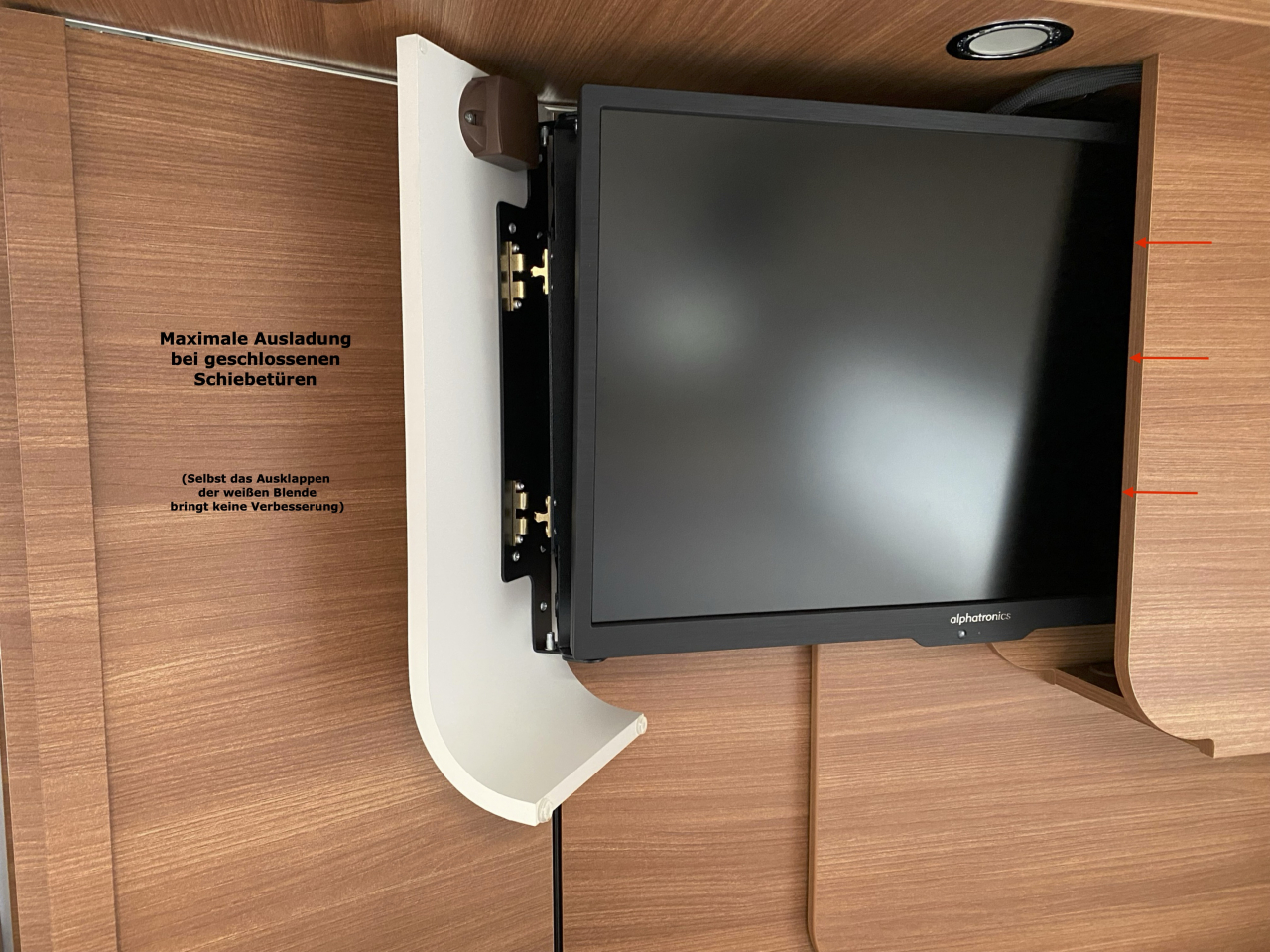 Maximal möglicher Auszug des hinteren TFT-Auszugs bei geschlossenen Schiebetüren. Es ist nur noch die Hälfte des Bildschirms sichtbar.