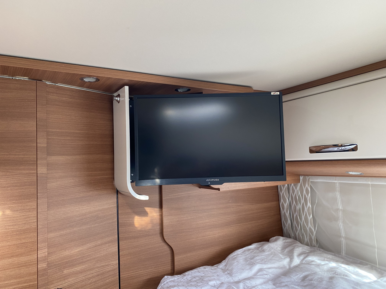 Bildschirm ausgefahren und nach rechts schräg gestellt; die Verwendung des Halters ermöglicht also zudem auch noch eine variable Anordnung, bei geschlossenen Schiebetüren.
