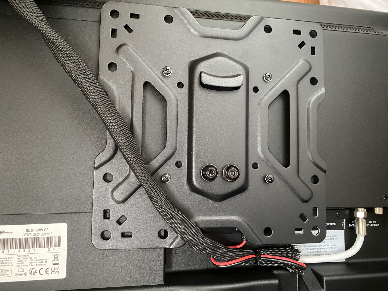 An den Fernseher angeschraubte Halteplatte des USX-Halters, unter Verwendung der vier Kreuzschlitzschrauben der alten Haltevorrichtung.
