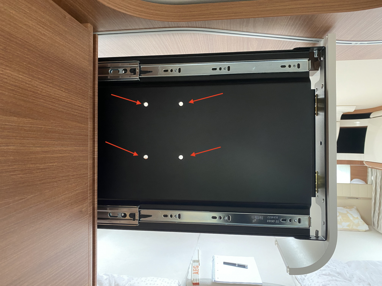 Rückwand der Halteplatte des TFT-Auszugs hinten bei abgeschraubtem Fernseher.
