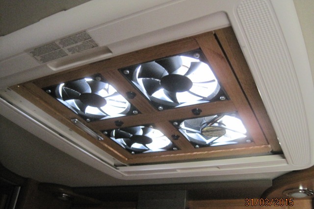 vier 12V-PC-Lüfter (10-12cm) ergeben eine vierstufige Be/Entlüftung. Angenehm im Sommer.